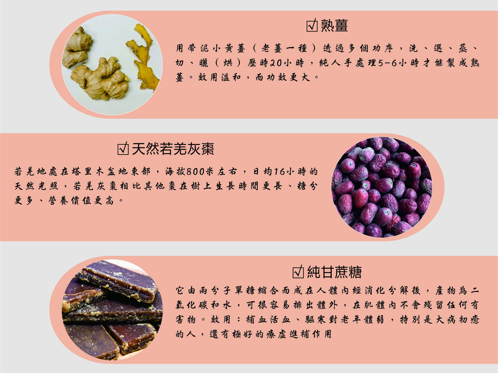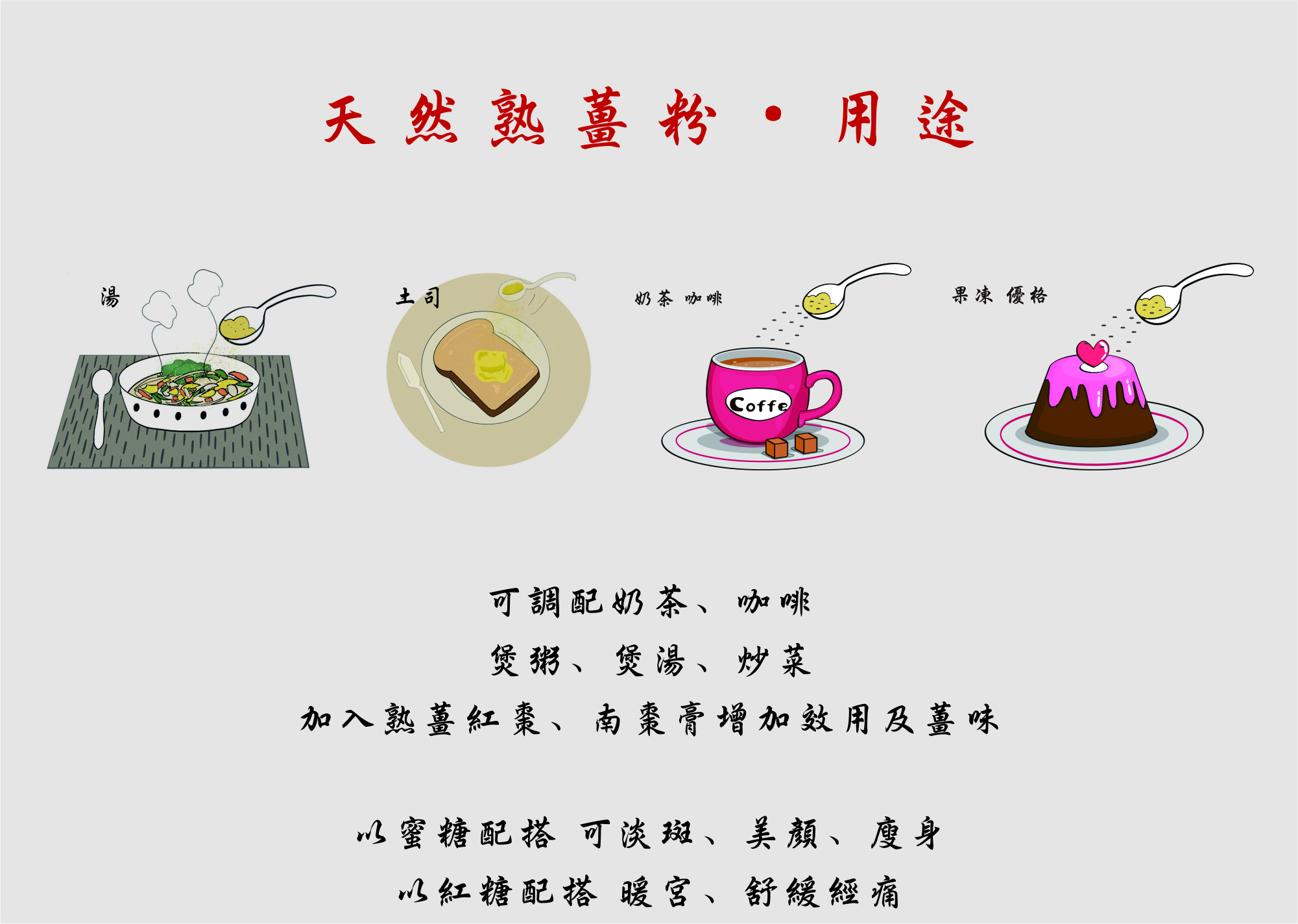 如體質寒症較重可加入 仨薑 天然手工熟薑粉(2--3g)增加效用或改善甜度
